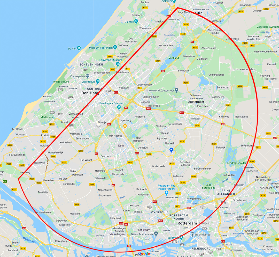 Delft,Den Hoorn zh, Schipluiden, Berkel en Rodenrijs, Pijnacker, Nootdorp, Delfgauw. Zoetermeer, Leidschendam, Rijswijk, Voorburg, Berkel en Rodenrijs, Bergschenhoek, Bleiswijk, Zevenhuizen, De Lier, ‘s-Gravenzande, Honselersdijk, Den Hoorn (zh), Wateringen, Monster, Maasland, Maassluis. Rotterdam (NWWI selecteert zelf), Den Haag (NWWI selecteert zelf), Schiedam.